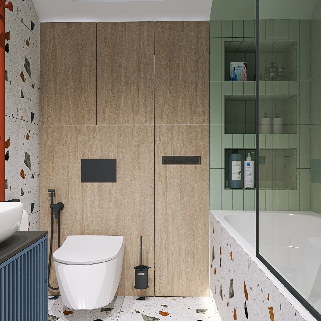 Яркие пятна на плитке тераццо и мятный акцент, создающие ощущение игривости и свежести.